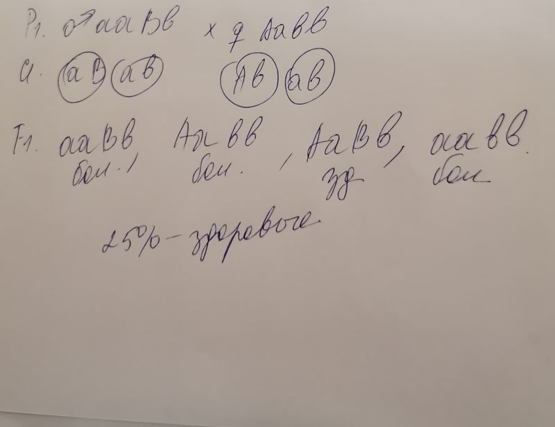 У человека есть две формы глухонемоты, которые определяются рецессивными аллелями разных генов а и b. Определите вероятность (%) рождения нормального ребенка в семье, где оба родителя имеют различные формы глухонемоты, а по второй паре аллелей они гетерозиготные.