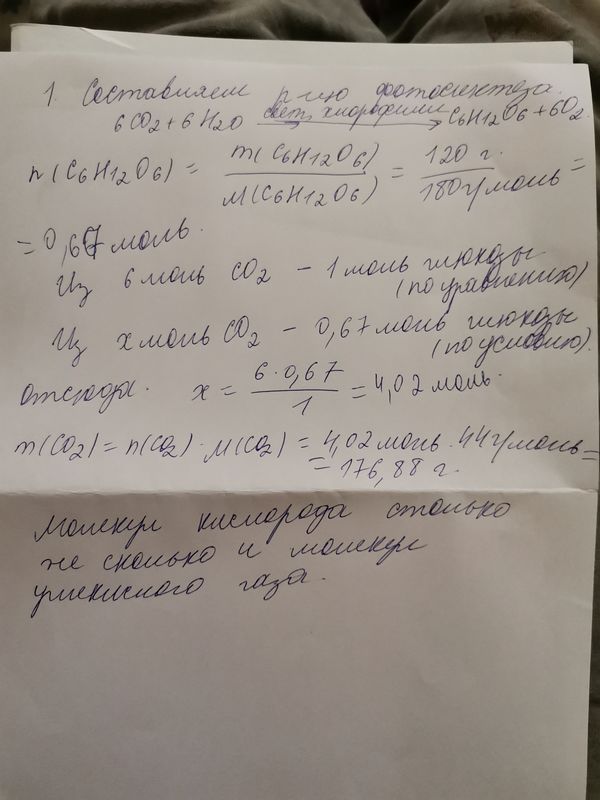 Решите задачу по биологии процессе фотосинтеза образовалось 120г глюкозы Сколько грамм углекислого газа было использовано листьями растения? Сколько при этом образовалось молекул кислорода?