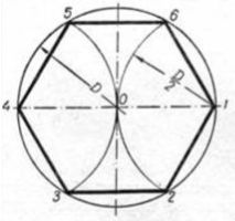 Первое. Чертится циркулем окружность в которую будет вписан шестиугольник Второе. Циркулем. с этим же радиусом окружность делится на шесть равных частей. Третье . Полученные точки соединяются прямыми линиями. Получили шестиугольник.