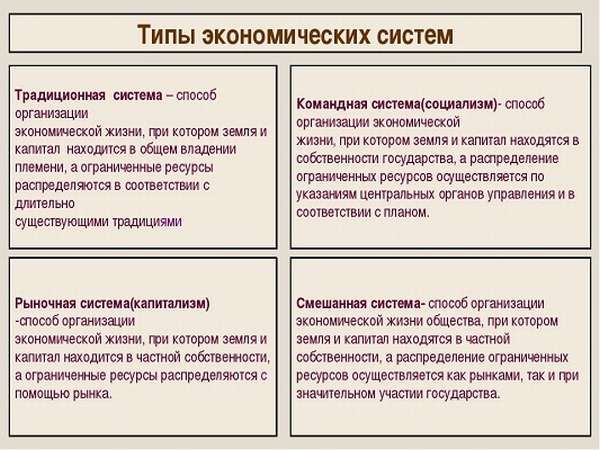 Экономическая система общества, представляет определенным образом упорядоченные между собой элементы экономики. К ним относят: право собственности на продукты и ресурсы, способы урегулирования экономического поведения в обществе, а так же социально-экономические отношения, возникающие между людьми. Для командно-административной экономики характерна координация экономической деятельности через централизованное планирование, ресурсы принадлежат исключительно государству.