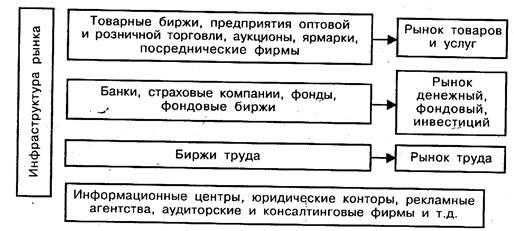 Рыночная инфраструктура представляет собой совокупность институтов, учреждений, служб, выполняющих функции по обеспечению нормального режима функционирования рынка. Непосредственно к ним можно отнести биржи, аукционы, аудиторские фирмы, страховые компании.
