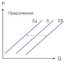 Сдвиг линии предложения означает увеличение предложения (перемещение вправо) или сокращение предложения (перемещение влево), вызванное неценовыми факторами, такими как: цены на ресурсы, величина налогов или субсидий, количество продавцов на рынке.