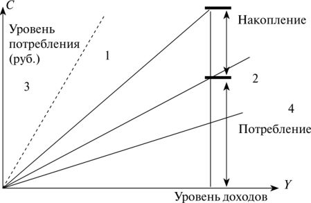 Если бы все доходы потребитель тратил на потребление, то зависимость потребления от доходов имела вид прямой, находящейся под углом 45 градусов к оси уровня доходов. На самом деле, у рационального потребителя есть склонность к сбережению, поэтому на практике график принимает следующий вид.