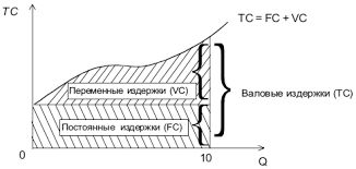 Постоянные издержки принимают значения, которые остаются неизменными, при любом объеме производства, и на графике имеют линию прямой. Переменные издержки напрямую зависят от производимого объема продукции фирмой и на графике имеют вид восходящей прямой. Общие издержки представляют собой арифметическую сумму постоянных и переменных издержек.