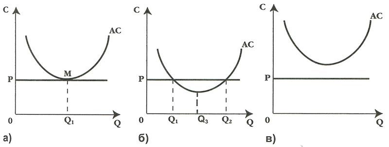 Если организация выходит на рынок совершенной конкуренции со своим продуктом, то возможны три варианты ее поведения относительно соотношения величины ее минимальных средних издержек и цены, предлагаемой на ее продукцию рынком. Первый, рыночная цена соответствует ее минимальным издержкам. Второй вариант, когда издержки выше цены предлагаемой рынком, и фирма несет убытки и уходит с рынка. И последний, самый выгодный вариант, когда цена на продукцию выше минимальных средних издержек, и фирма на рынке будет получать прибыль.