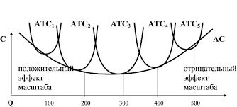 Кривую долгосрочных средних издержек имеет дугообразную форму, так же ее называют кривой планирования. Она состоит из небольших участков краткосрочных кривых средних общих издержек за определенный долгосрочный период времени. Нисходящая часть линии кривой объясняется положительным эффектом масштаба. Данный эффект связан: а) с возможностью осуществления более глубокой специализацией труда рабочих и более эффективного распределения времени управленцев (топ-менеджеров); б) более эффективного использования оборудования, и внедрения прогрессивных технологий; в) возможности осуществления диверсификации производства.
