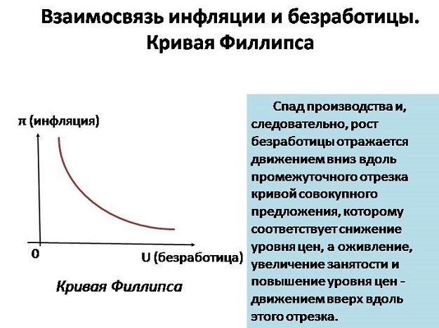 В настоящее время, для иллюстрации данной зависимости используют кривую Филлипса,в честь экономиста который впервые рассчитал такую зависимость. На кривой видно, что чем выше уровень прироста цен, тем ниже уровень безработицы. Стоит отметить, что такая, обратная зависимость, относиться только к краткосрочному периоду времени.