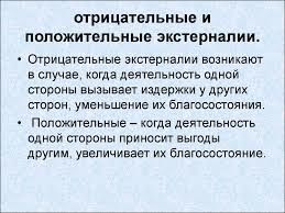 Под экстерналиями в экономике понимают так называемые внешние эффекты, возникающие когда рыночный механизм не отражает в цене полный эффект производства. Например, рыночная цена может не учитывает угрозы воздействия на окружающую среду, и лишь государство, через правовое воздействие может заставить рынок учитывать фактор экологичности.