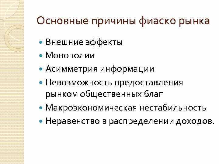 Ситуация, когда рыночный механизм не способен обеспечить эффективное и справедливое использование ограниченных ресурсов в обществе, называется фиаско рынка. Например, в погони за увеличение прибыли страдает экология, так же с точки зрения рынка, здравоохранение должно быть прибыльным, а здоровье нации не является приорететной, рынок не в состоянии обеспечить сбалансированное региональное развитие страны.