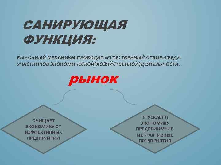 Санирующая или оздоровительная функция рынка,напрямую связана с конкуренцией, которая "избавляется" от организаций, которые неэффективно используют ресурсы, и наоборот поддерживает предприимчивых и изобретательных участников рынка.