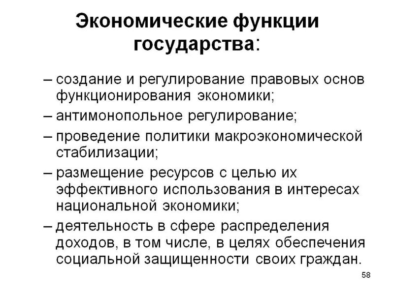 К основным функциям, которые выполняет государство в экономике относят: а) правовую; б) перераспределение доходов; в) производство общественных благ; г) стабилизация экономики; д) защита конкуренции; е) проведение социальной политики; ж) финансирование фундаментальной науки.
