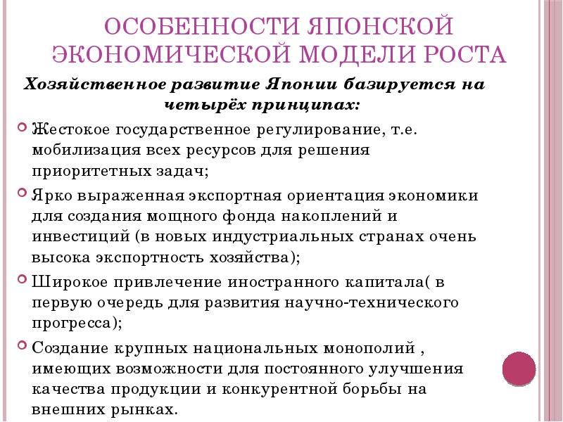 Среди современных экономических систем выделяют японскую экономическую модель, для которой характерно: а) активная позиция государства в модернизации экономики; б) значительная роль планирования в некоторых сферах экономики; в) социальная ориентация фирм (пожизненный найм, коллективная ответственность); г) сильная поддержка государства предпринимательских структур.