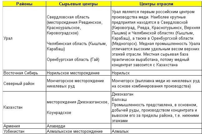 Главные центры производства меди находятся на Урале