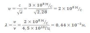 Дано: v = 4,5*1010 Гц — частота колебаний в вакууме, ε = 2,28 — диэлектрическая проницаемость бензола, ε0 =8,85*10-12 Ф/м — электрическая постоянная, μ0 = 4π*10-7 Гн/м — магнитная постоянная.