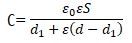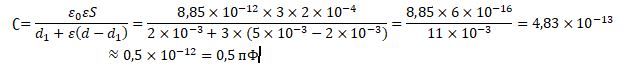 Физика. Задание из теста Диэлектрическую пластину толщиной 2мм с диэлектрической проницаемостью равной 3 вдвигают параллельно симметрично обкладкам конденсатора. Определить электроемкость конденсатора, если площадь обкладок воздушного конденсатора 2см^2, расстояние между ними 5мм.