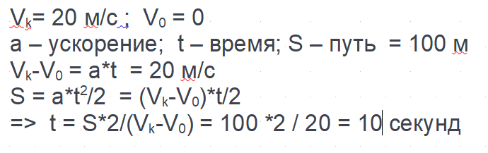 Задача по физике Скорость автомобиля, движущегося равноускоренно по прямой дороге, на пути 100 метров увеличилась с 0 до 20 м/с. Сколько времени длился разгон?