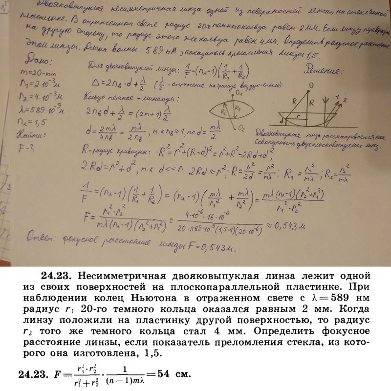 Физика задача с ЛИНЗАМИ!!! Кто поможет?? Двояковыпуклая несимметричная линза одной из поверхностей лежит на стеклянной пластинке. В отраженном свете радиус 20-го темного кольца равен 2мм. Если линзу перевернуть на другую сторону, то радиус этого же кольца равен 4мм. Определить фокусное расстояние этой линзы. Длина волны 589нм, показатель преломления линзы 1,5,