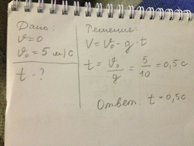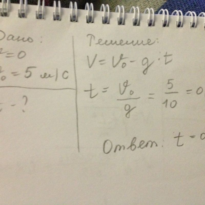 Мяч брошен со скоростью 5 м/с вертикально вверх. Через сколько времени он достигнет верхней точки ? Ускорение свободного падения принять равным 10 м/с квадратных.