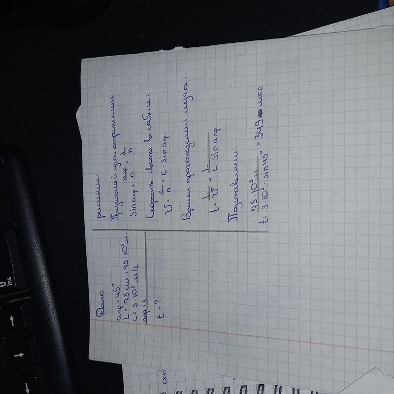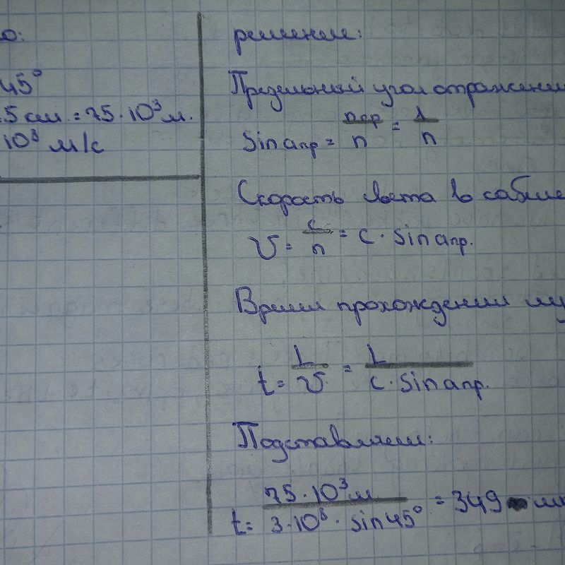 Найди, за какое время свет пройдёт по световоду длиной L=75 км, если предельный угол отражения вещества из которого выполнена сердцевина световода, αпр =45° (показатель преломления оболочки световода равен 1). Ответ (округли до сотых): мс.