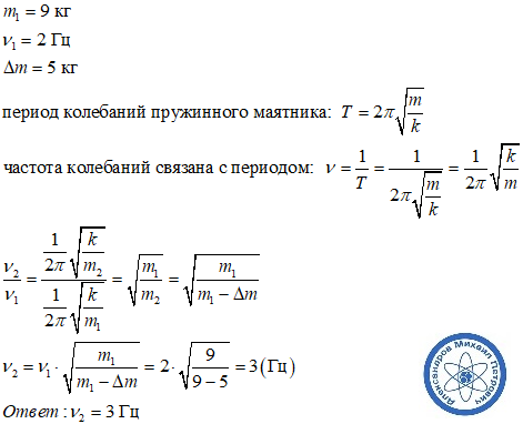 Пружинный маятник массой 9 кг совершает колебания с частотой 2 Гц. Скакой частотой будет совершать колебания маятник, если его массу уменьшитьна 5 кг?