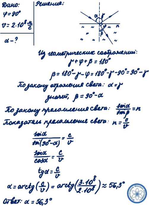 Под каким углом световой луч падает на плоскую поверхность стекла,если отраженный и преломленный лучи образуют между собой прямой угол? Скорость света в стекле V=2*10 в 8 степени м/с