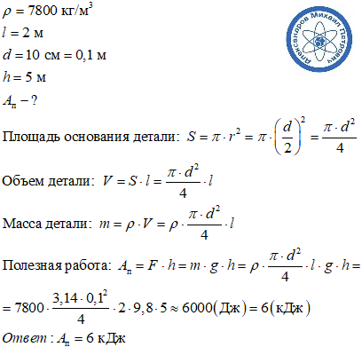 Кран поднимает вертикально вверх стальную цилиндрическую деталь длиной 2м, диаметром 10см на высоту 5м. какую полезную работу совершил кран?