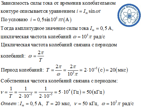 В колебательном контуре зависимость силы тока от времени описывается уравнением i=0,5sin10^5 пи t. Найти амплитуду силы тока, период, собственную и циклическую частоту электромагнитных колебаний.