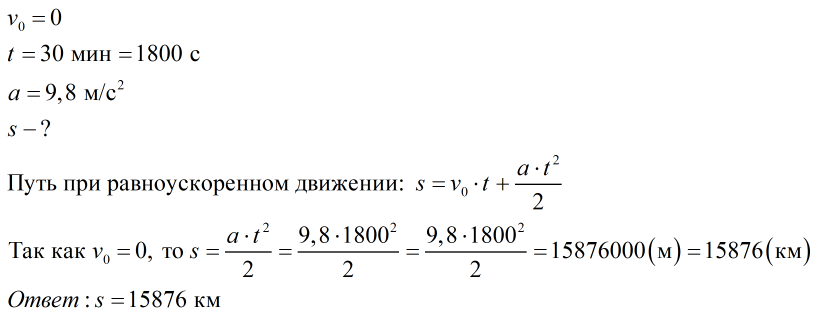 На каком расстоянии от земли оказался бы космический корабль через 30 мин после старта если бы он все время двигался прямолинейно с ускорением 9,8 м/с2