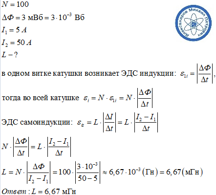 Магнитный поток через катушку имеющий 100 витков изменяется на 3мВб при изменении тока от 5А до 50А. найти индуктивность катушки