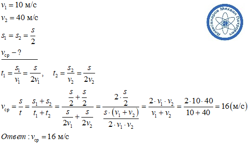 Первую половину пути тело проходить с скоростью 10 м за сек, а вторую половину с скоростью 40 м за сек. Найдите среднюю скорость!!