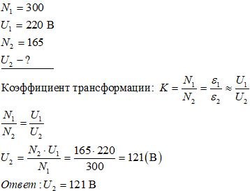 Трансформатор, содержащий в первичной обмотке 300 витков, включен в сеть напряже-нием 220В. Вторичная цепь содержит 165 витков. Чему равно напряжение во вторичной цепи?