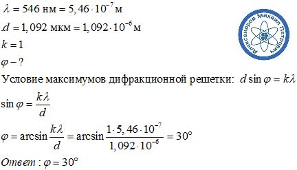 Дифракционная решетка/максимум. Физика. Дифракционная решетка освещена нормально падающим светом длиной волны 546 нм. период решетки равен 1,092 мкм. Под каки углом будет наблюдаться первый дифракционный максимум.