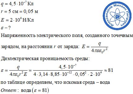 В какую среду помещен точечный электрический заряд 4,5*10 ^(-7) Кл, если на расстоянии 5 см от него напряженность поля равна 2*10^4 Н/Кл?