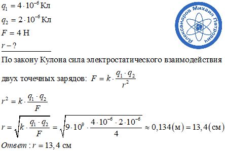 На каком расстоянии находятся два точечных заряда 4*10^-6 Кл и 2*10^-6 Кл, если они взаимодействуют с силой 4Н