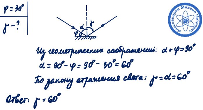 Между падающим лучом света и зеркалом 30 градусов каков угол отражения этого луча света от Зеркала