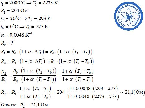 Вольфрамовая нить электрической лампы при температуре t1 = 2000 °С имеет сопротивление R1 = 204 Ом. Определите ее сопротивление при температуре t2 = 20 °С