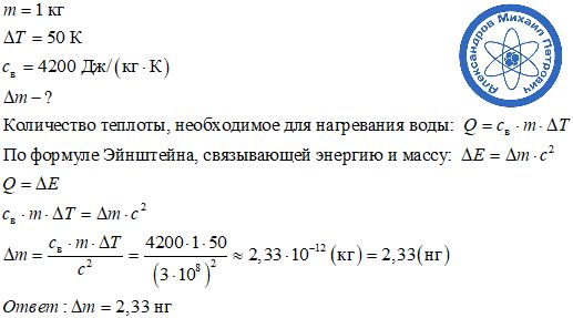 Воду массой 1 кг нагрели на 50 К. На сколько увеличилась при этом её масса?