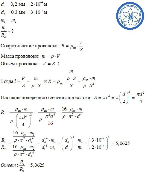 Имеются два мотка медной проволоки диаметрами d1=0,2мм и d2=0,3мм.Массы мотков равны.Во сколько раз сопротивление у первого мотка больше чем у второго?