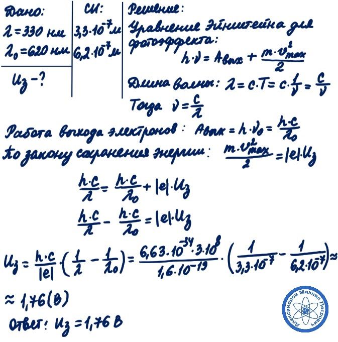Найдите запирающее напряжение для электронов при освещение металла светом с длиной волны 330нм.если красная граница фотоэфекта для металла 620нм