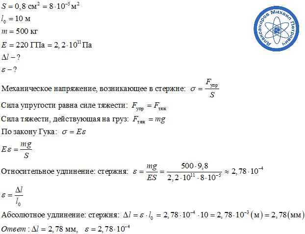Чему равно удлинение стального стержня сечением 0,8 см2 и длиной 10м под действием груза массой 500кг?(E=220ГПа)