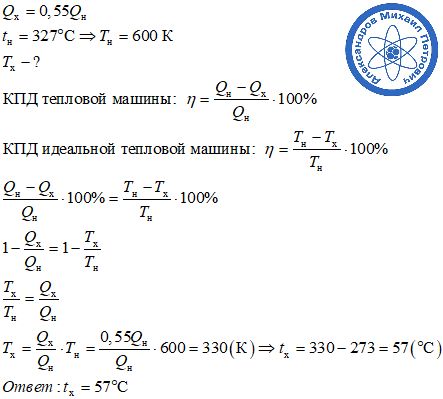 В идеальной тепловой машине газ отдал холодильнику 55% количества теплоты, полученной от нагревателя. Определите температуру холодильника, если температура нагревателя равна 327С