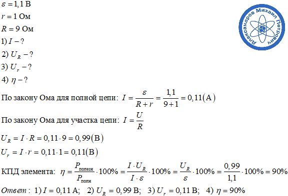 Элемент с эдс в 1,1 в и внутренним сопротивлением в 1 Ом замкнут на внешнее сопротивление 9 Ом. Найти: 1) Силу тока цепи; 2) Падение потенциала во внешней цепи; 3) падение потенциала внутри элемента; 4) С каким КПД работает элемент.