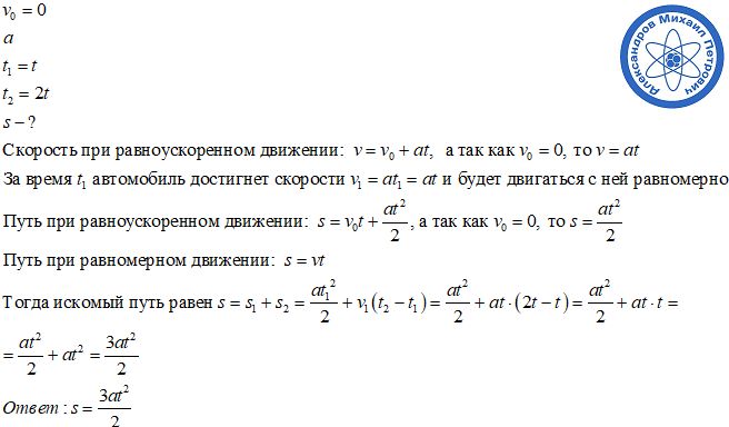Автомобиль без начальной скорости начинает двигаться равноускоренно с ускорением "а". Через время t от начала движения скорость автомобиля перестает изменяться. Определить путь автомобиля, пройденый им за время 2t.