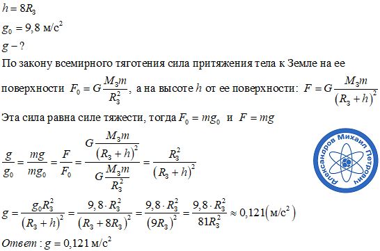Рассчитайте ускорение саободного падения на 8 земных радиусов. На поверхности земли считать 9,8 м/с^2
