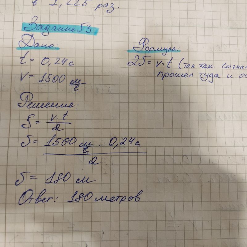 Какова глубина моря под судном, если ультразвуковой сигнал, направленный вертикально вниз, вернулся через 0,24 с?