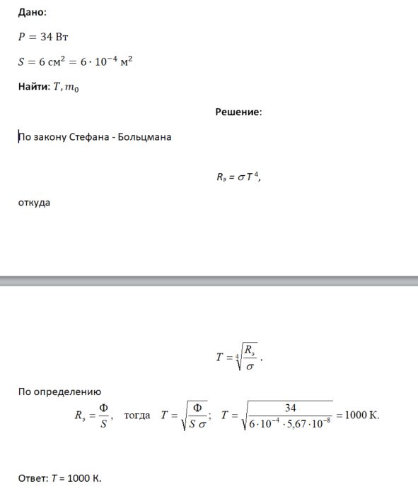 Задача по Физике Квантово-оптические явления. Физика атома (§ 34-39) >> §34 Законы теплового излучения >> задача - 34.2 Поток энергии, излучаемый из смотрового окошка плавильной печи, равен 34 Вт. Определить температуру в печи, если площадь отверстия S = 6 см2 (печь с окошком считать моделью абсолютно чёрного тела). Определить также массу одного фотона той части светового потока, которая соответствует максимальному значению излучательной способности печи.не могу массу определить