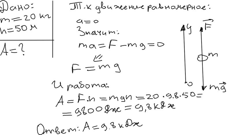 Тело массой 20 кг равномерно поднимают на высоту 50 м. Определите какую работу совершают?