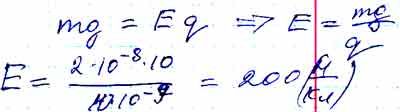 Задача 34. В вертикально направленном однородном электрическом поле капелька массой 2×10^-8 кг, имеющая заряд 10^-9 Кл, оказалось в равновесии. Определите напряженность электрического поля.