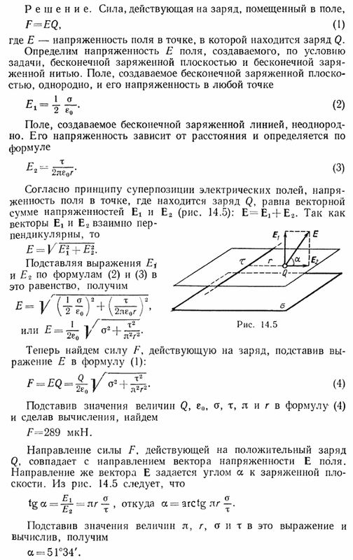 Электрическое поле создано бесконечной плоскостью, заряженной с поверхностной плотностью σ=400 нКл/м2, и бесконечной прямой нитью, заряженной с линейной плотностью τ=100 нКл/м. На расстоянии r=10 см от нити находится точечный заряд Q=10 нКл. Определить силу, действующую на заряд, ее направление, если заряд и нить лежат в одной плоскости, параллельной заряженной плоскости.