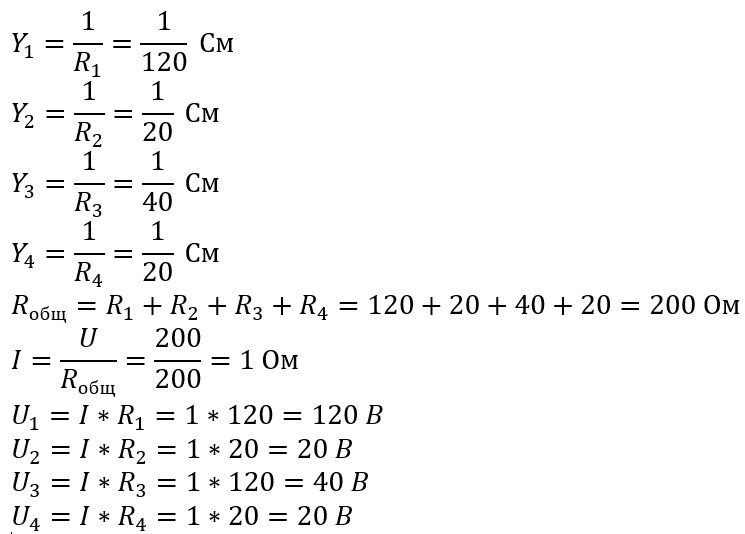 Задание по электротехнике. R1=120 ом R2=20 ом R3= 40 ОМ R4=20 ом U200 В Найти Y1 Y2 Y3 Y4 U1 U2 U3 U4 Rобщ.
